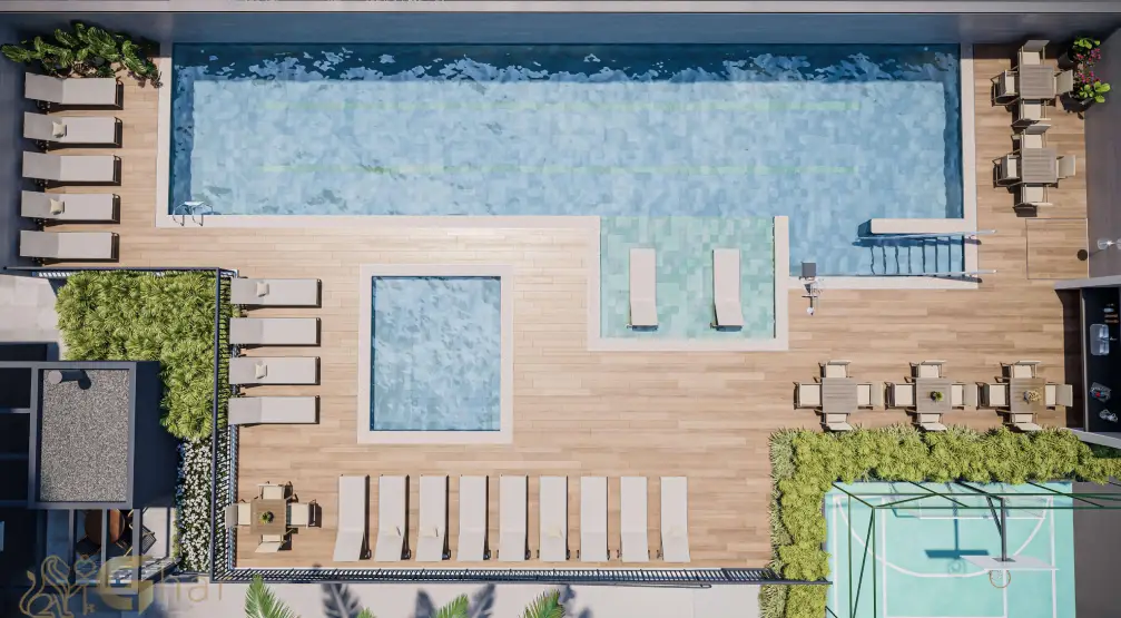 As plantas das áreas de convivência do condomínio demonstram um projeto de lazer completo, distribuído de forma estratégica para atender todas as idades. Os espaços foram planejados para proporcionar bem-estar, socialização e momentos de descanso, sempre integrados à arquitetura moderna do empreendimento.