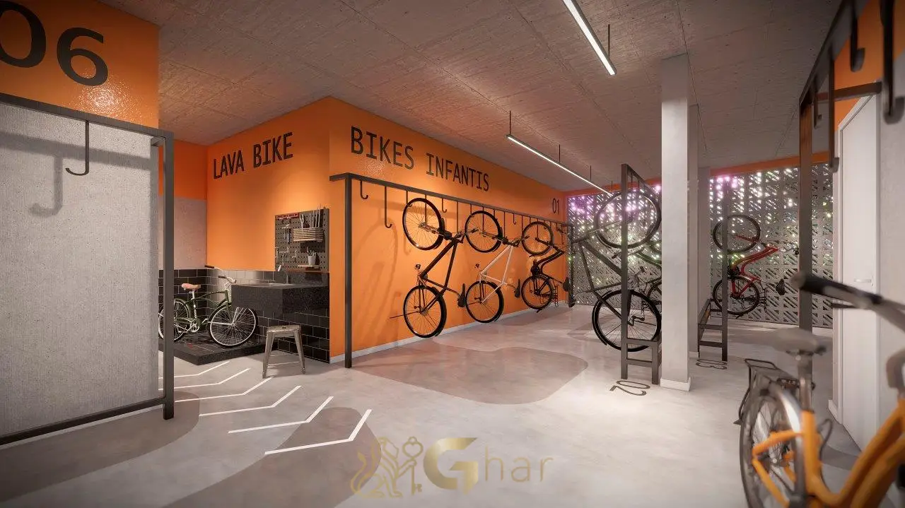 Estacionamento interno exclusivo para bicicletas, equipado com suportes e, em alguns casos, estação de manutenção, incentivando a mobilidade sustentável e saudável.
