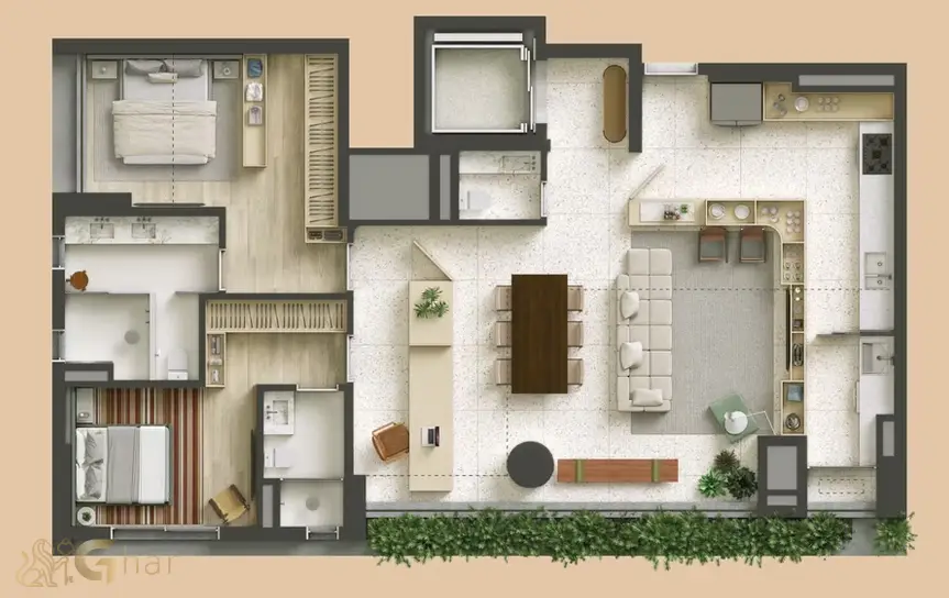 Todas as imagens têm caráter meramente ilustrativo e não constituem oferta de produto ou serviço. Em fotos de decorados, perspectivas artísticas e plantas com sugestão de decoração, os materiais efetivamente entregues seguem o memorial descritivo. Mobiliário, equipamentos, objetos de decoração, pisos, rodapés, louças, metais, molduras, forros, sancas e pontos de iluminação não integram o contrato de aquisição, salvo indicação expressa em documento comercial. Serviços de áreas comuns eventualmente citados dependem de deliberação em assembleia de condôminos. Os diferenciais mencionados podem não se aplicar a todas as unidades, ainda que de igual tipologia.
