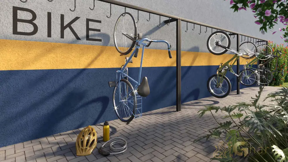Estacionamento interno exclusivo para bicicletas, equipado com suportes e, em alguns casos, estação de manutenção, incentivando a mobilidade sustentável e saudável.