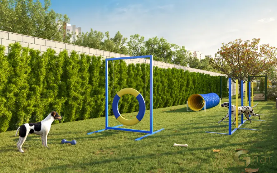 Área dedicada para cães e gatos, equipada com brinquedos, pistas de agility e espaços para socialização dos pets com segurança e comodidade.