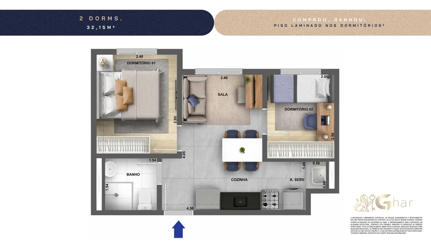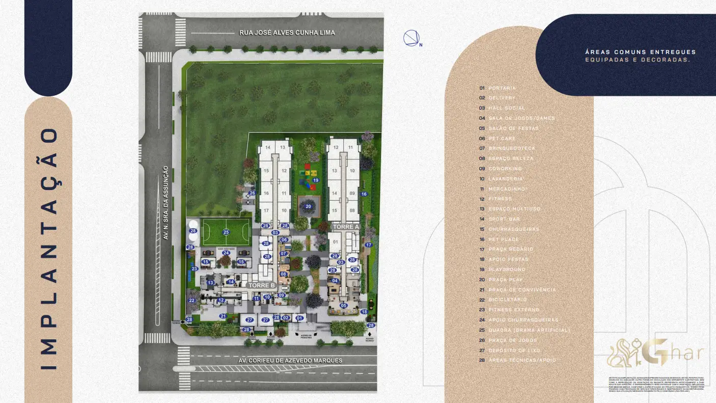 Todas as imagens têm caráter meramente ilustrativo e não constituem oferta de produto ou serviço. Em fotos de decorados, perspectivas artísticas e plantas com sugestão de decoração, os materiais efetivamente entregues seguem o memorial descritivo. Mobiliário, equipamentos, objetos de decoração, pisos, rodapés, louças, metais, molduras, forros, sancas e pontos de iluminação não integram o contrato de aquisição, salvo indicação expressa em documento comercial. Serviços de áreas comuns eventualmente citados dependem de deliberação em assembleia de condôminos. Os diferenciais mencionados podem não se aplicar a todas as unidades, ainda que de igual tipologia.