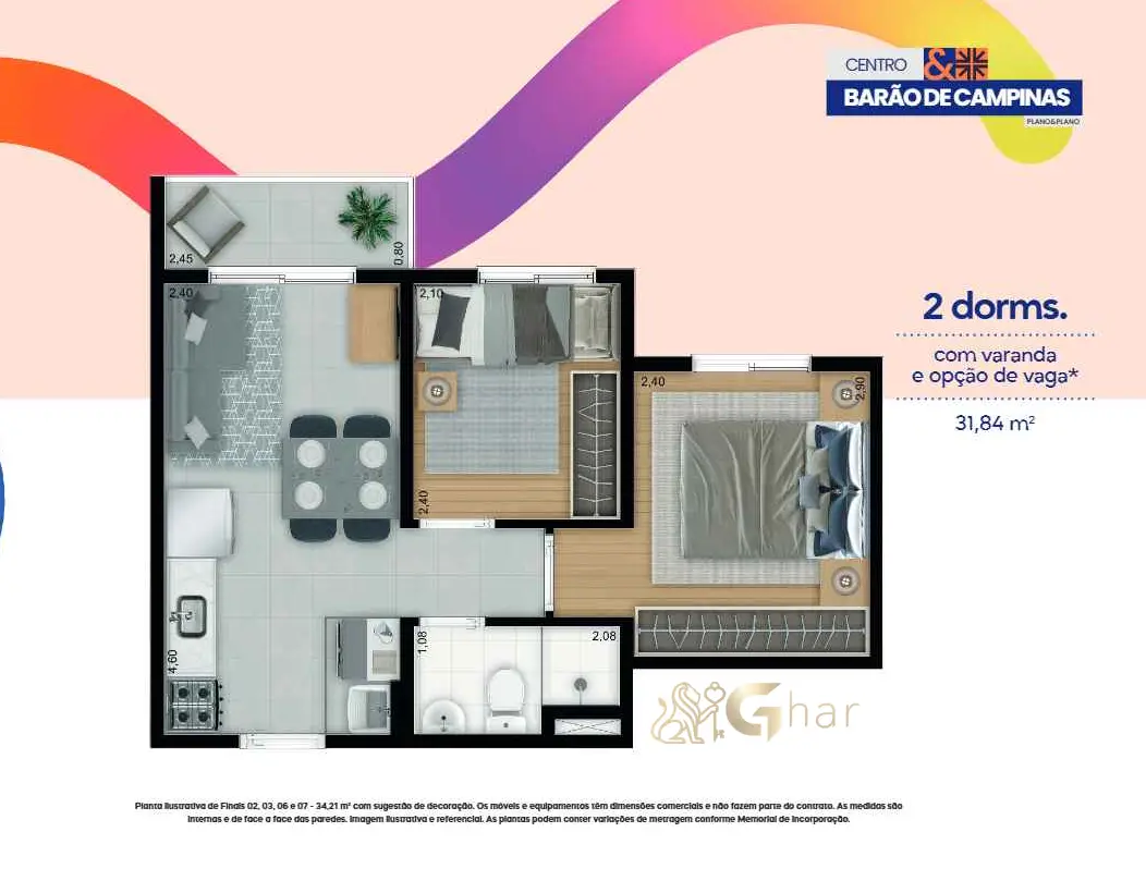 Todas as imagens têm caráter meramente ilustrativo e não constituem oferta de produto ou serviço. Em fotos de decorados, perspectivas artísticas e plantas com sugestão de decoração, os materiais efetivamente entregues seguem o memorial descritivo. Mobiliário, equipamentos, objetos de decoração, pisos, rodapés, louças, metais, molduras, forros, sancas e pontos de iluminação não integram o contrato de aquisição, salvo indicação expressa em documento comercial. Serviços de áreas comuns eventualmente citados dependem de deliberação em assembleia de condôminos. Os diferenciais mencionados podem não se aplicar a todas as unidades, ainda que de igual tipologia.