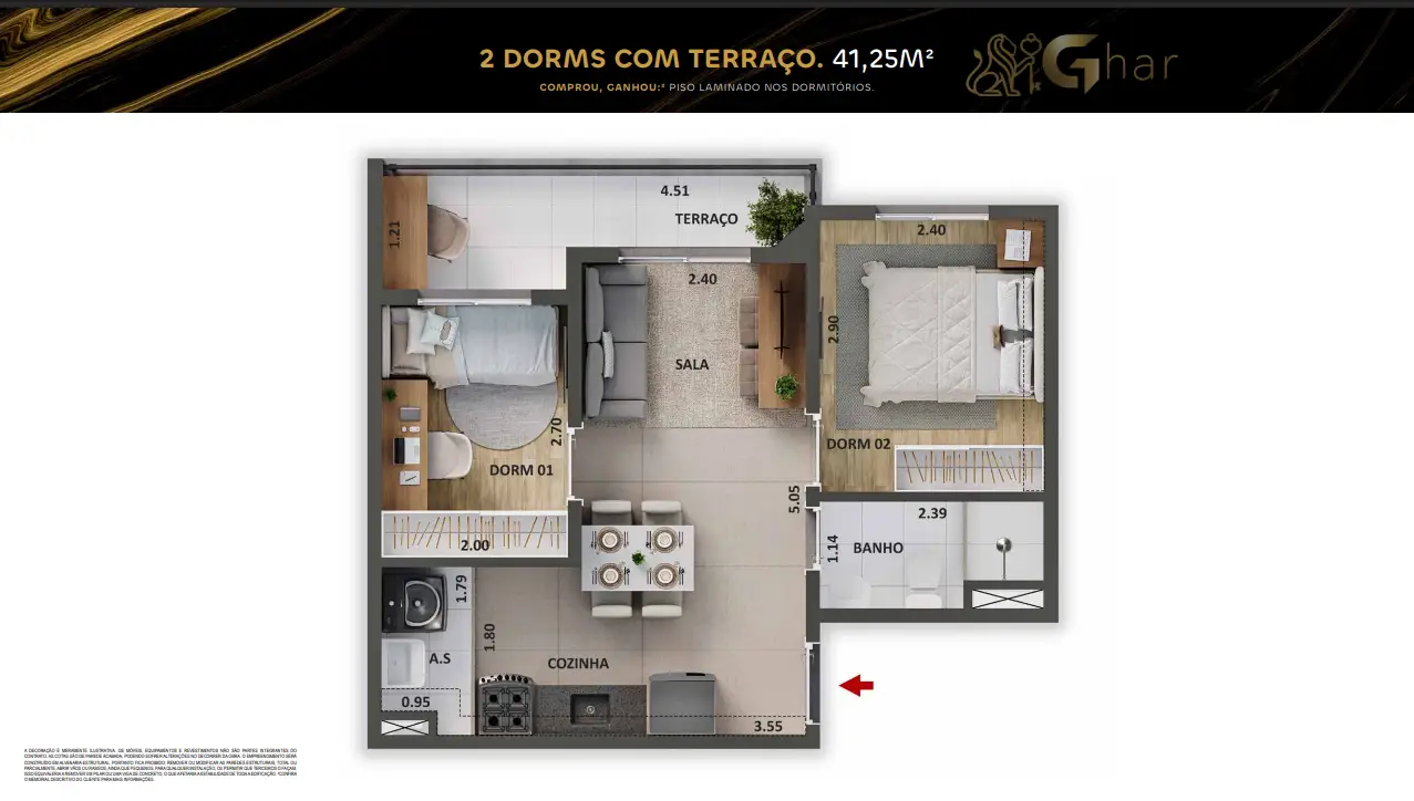2 dormitórios com terraço – 41,25 m²