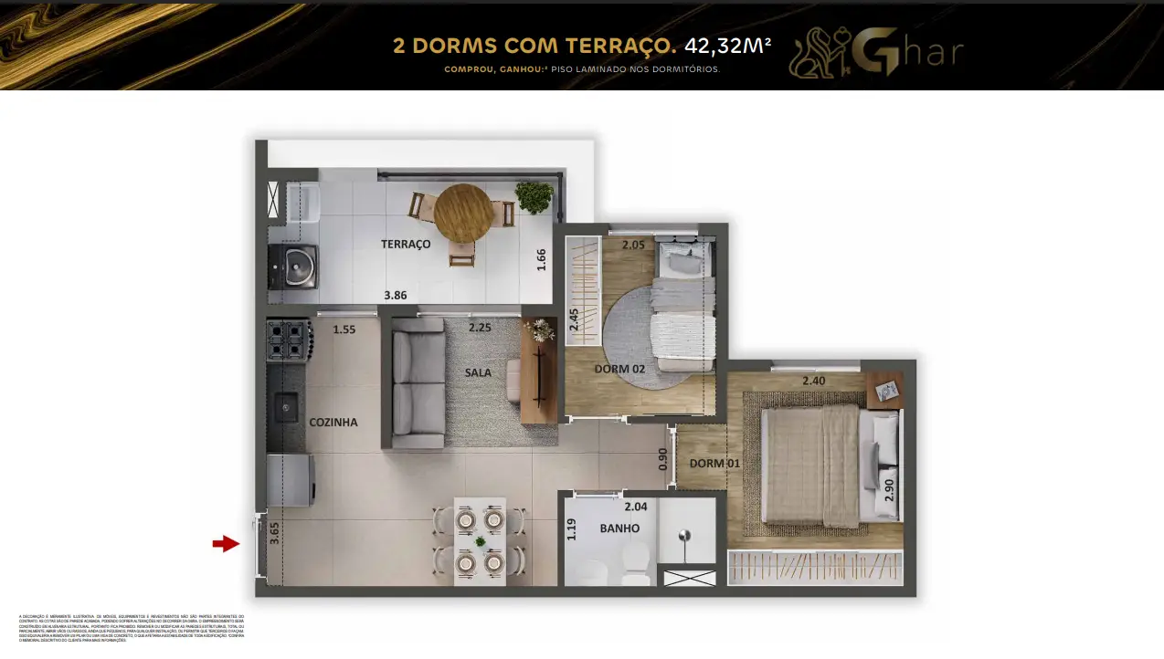 2 dormitórios com terraço – 42,32 m²
