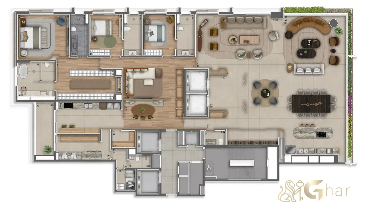 Os decorados do Granoscar destacam salas amplas, terraço integrado à área social com caixilho recolhível, cozinha ventilada e suítes espaçosas com preparação para persianas automatizadas. A curadoria de design privilegia texturas naturais, iluminação cênica e layouts fluídos que facilitam o uso diário, a privacidade e a personalização — um padrão de alto luxo pronto para receber o seu estilo de vida.