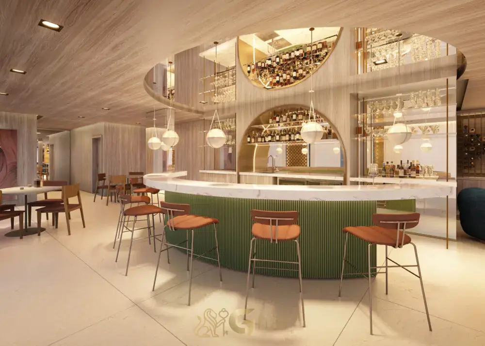 O masterplan valoriza fluxos independentes (social/serviço), porte-cochère para embarque/ desembarque, lobby com pé-direito duplo, espelho d’água e áreas de lazer em zonas temáticas (fitness, relax, família e social). A quadra de beach tennis, a piscina com raia semiolímpica e os espaços gourmet integram lazer esportivo e convivência elegante.