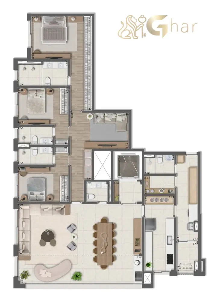• Tipologias amplas: 191 m² a 253 m² (3 e 4 suítes) + Gardens até 298 m² e Coberturas de 347 m² a 479 m².