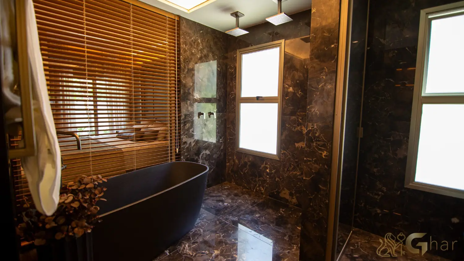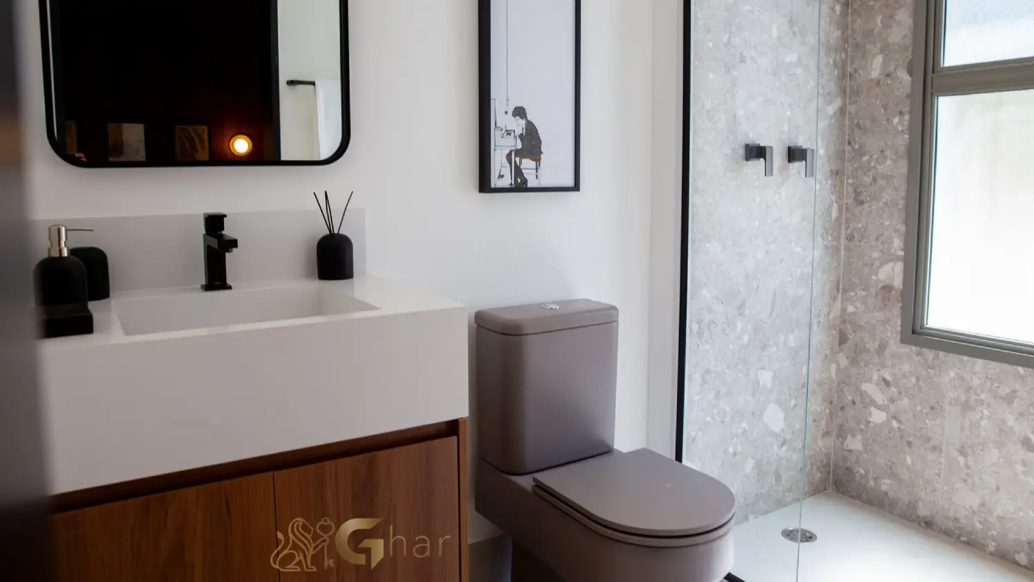 Banheiro de apoio elegante e funcional para atender visitantes, preservando a privacidade da área íntima da residência.