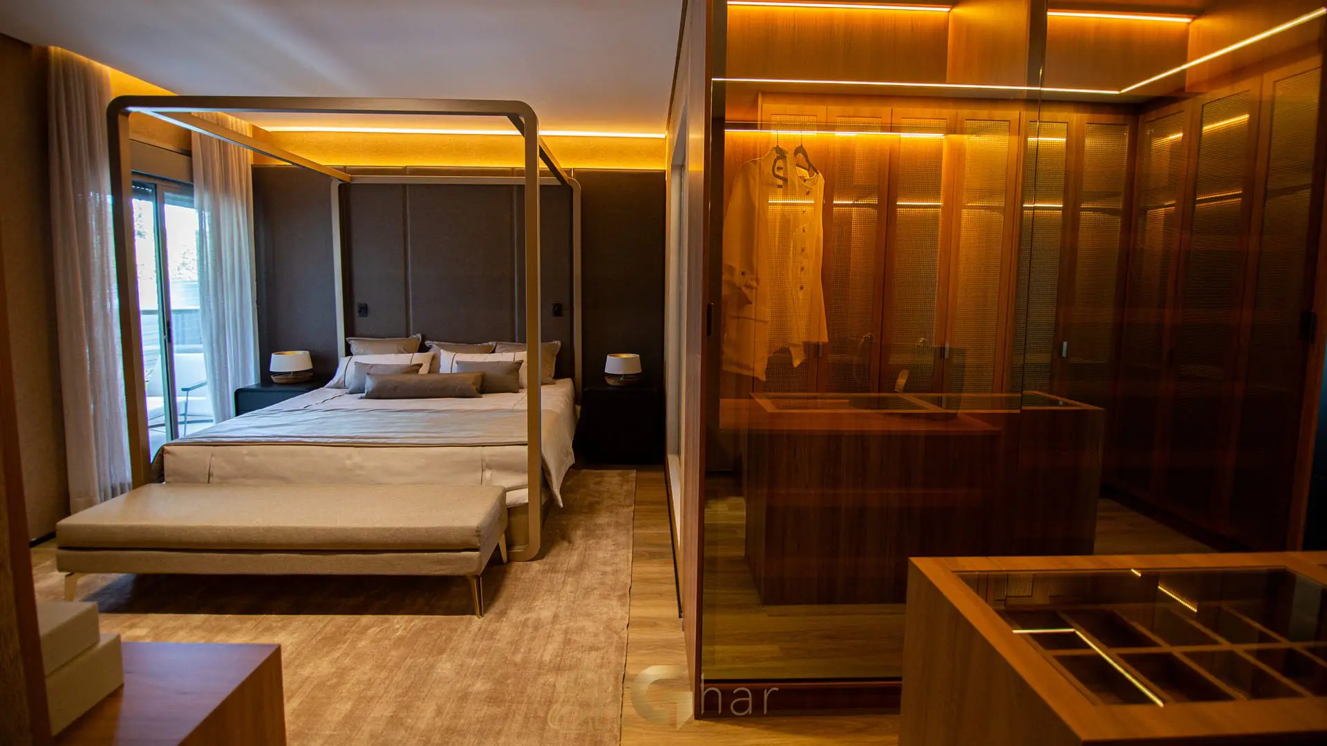 Suíte principal com espaço dedicado para closet, ideal para organizar roupas, calçados e acessórios de forma prática e elegante.