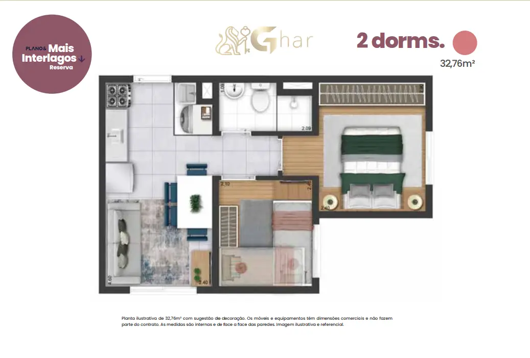 Os apartamentos do Plano&Mais Interlagos Reserva possuem valores a partir de R$ 213.480, com opções de 1 e 2 dormitórios e metragens entre 24 m² e 34 m².