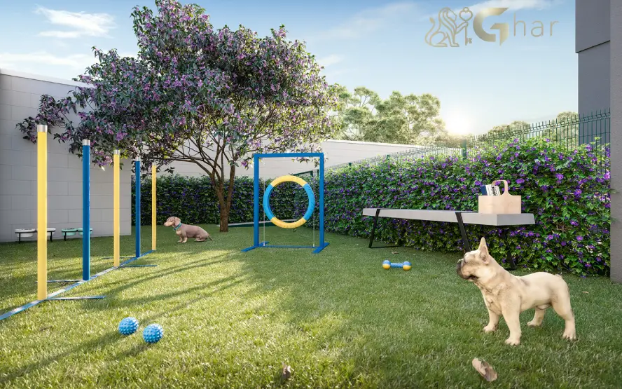 Área dedicada para cães e gatos, equipada com brinquedos, pistas de agility e espaços para socialização dos pets com segurança e comodidade.