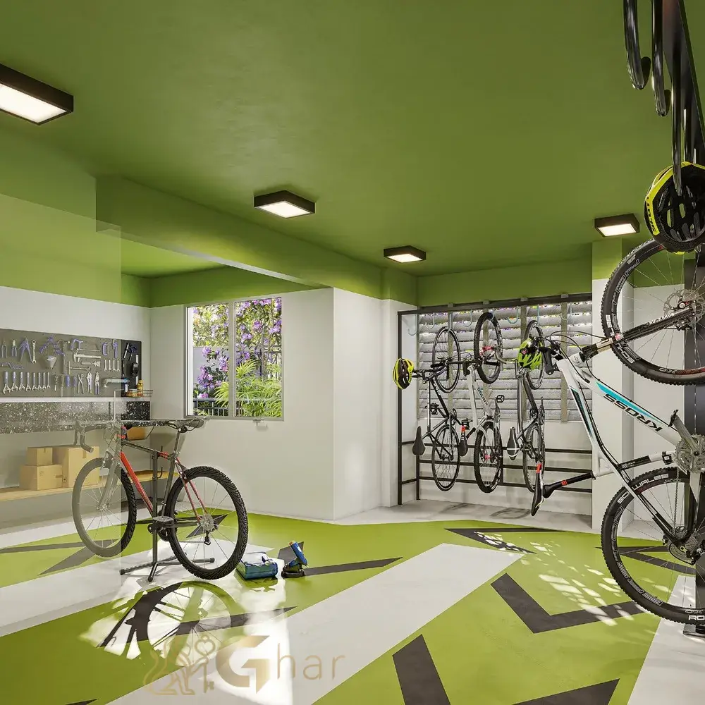 Estacionamento interno exclusivo para bicicletas, equipado com suportes e, em alguns casos, estação de manutenção, incentivando a mobilidade sustentável e saudável.
