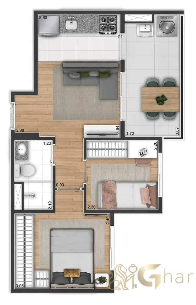 2 dormitórios (com ou sem suíte) e 3 dormitórios (com 1 suíte) oferecem layouts versáteis, pontos de ar-condicionado previstos e varanda integrada à área social (conforme tipologia). O resultado é praticidade, ventilação e luminosidade, mantendo circulação fluida e ótimo aproveitamento de cada metro.
