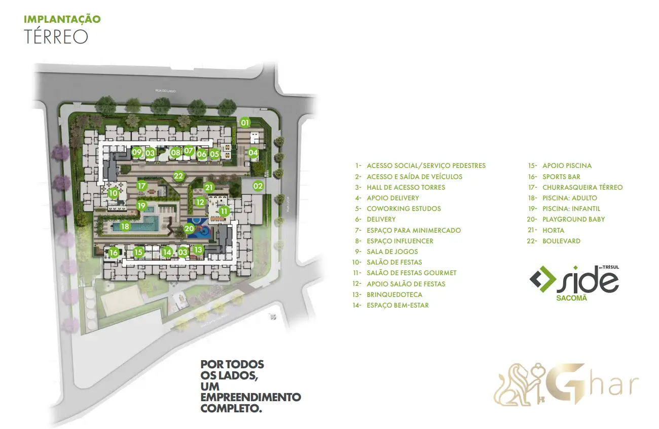 Com lazer de clube, o Side Sacomã oferece academia, piscinas, salões de festas, espaços gourmet, coworking e áreas kids, além de convívios externos para descanso e socialização. É o equilíbrio entre produtividade e diversão, sem sair de casa.