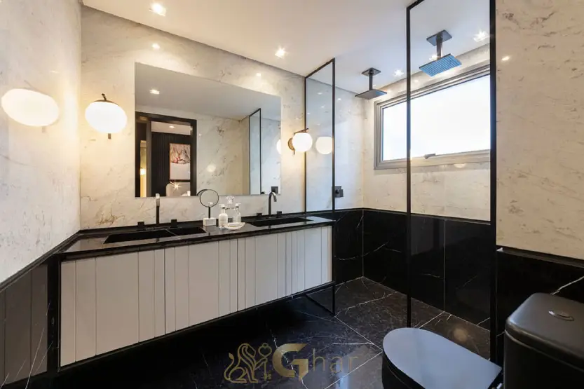 Banheiro de apoio elegante e funcional para atender visitantes, preservando a privacidade da área íntima da residência.
