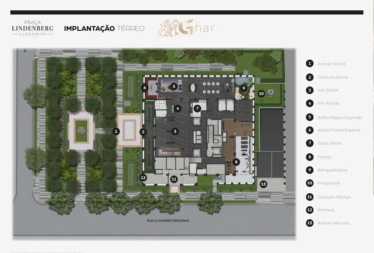 Implantado na Rua Clodomiro Amazonas, o projeto integra uma praça central de natureza exuberante, assinada por Benedito Abbud, conectando dois condomínios independentes em um conceito urbano sofisticado, inspirado em Nova York.