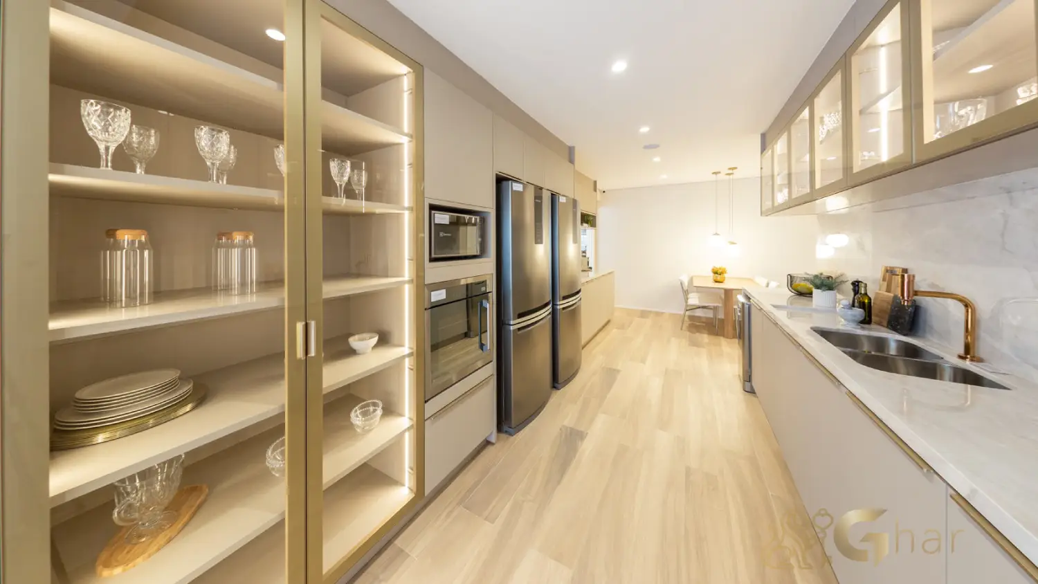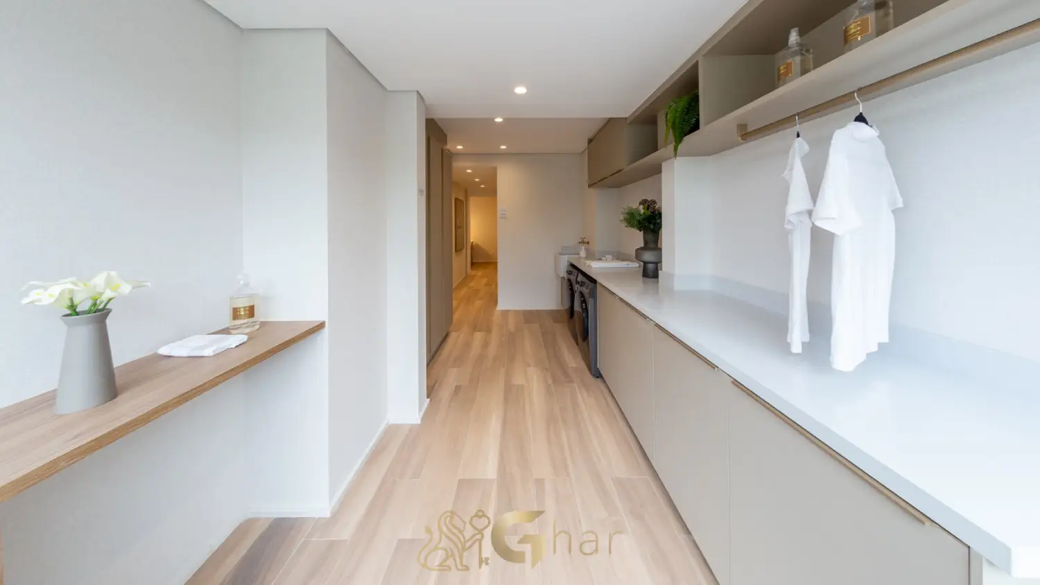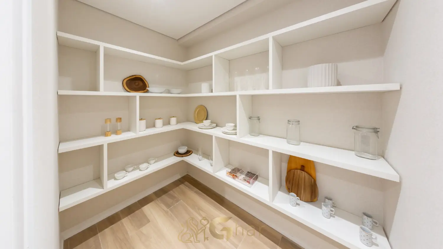 Espaço reservado próximo à cozinha ou área de serviço, perfeito para armazenar mantimentos, utensílios e produtos de limpeza, mantendo tudo organizado e acessível.
