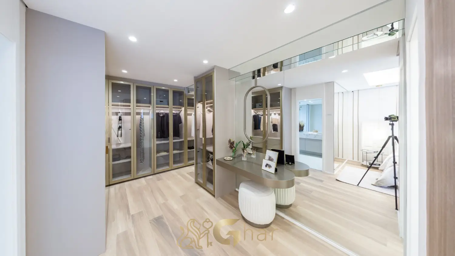 Suíte principal com espaço dedicado para closet, ideal para organizar roupas, calçados e acessórios de forma prática e elegante.