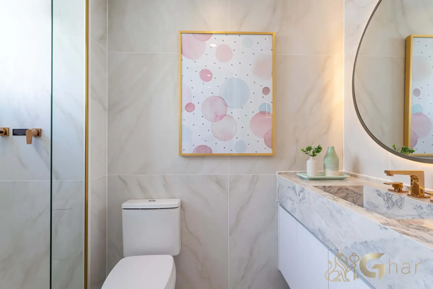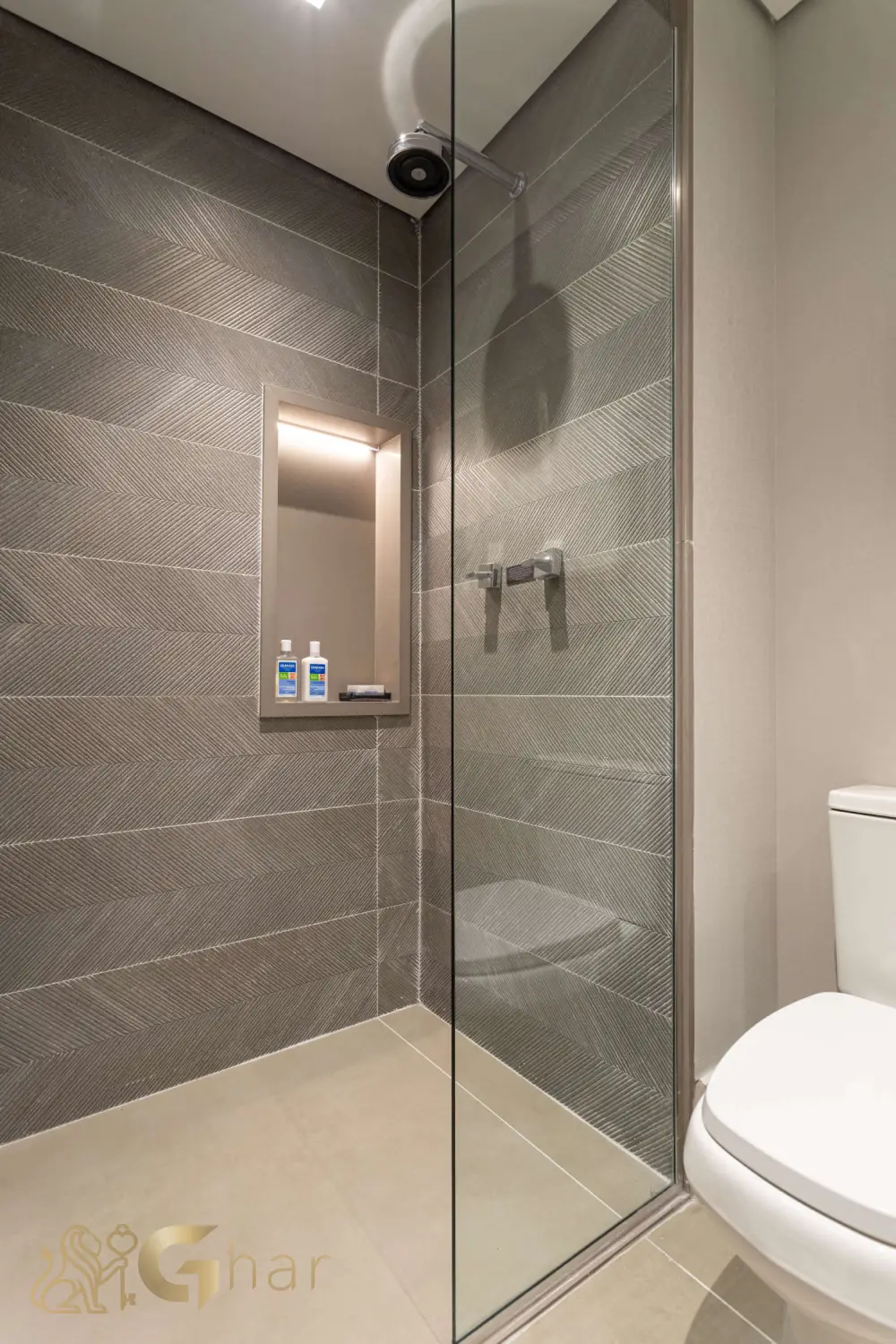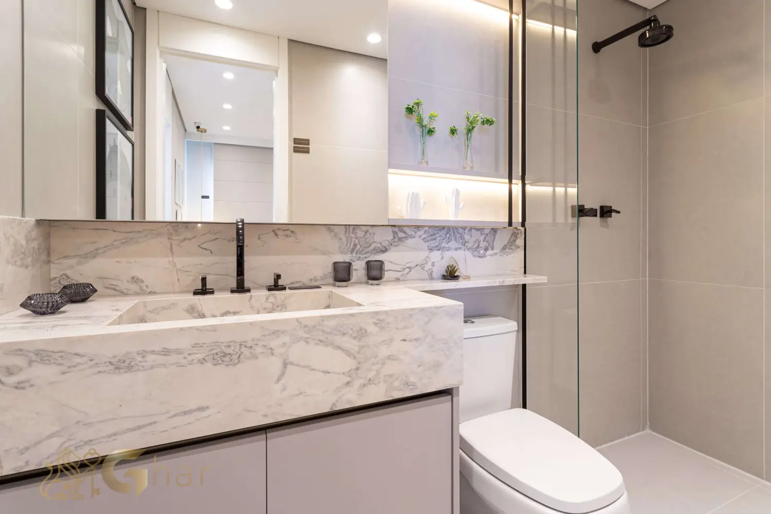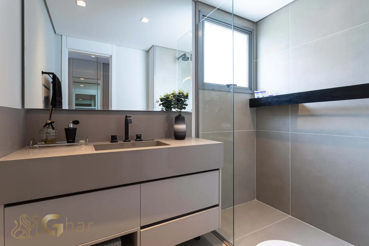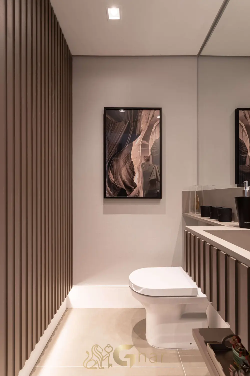 Banheiro de apoio elegante e funcional para atender visitantes, preservando a privacidade da área íntima da residência.