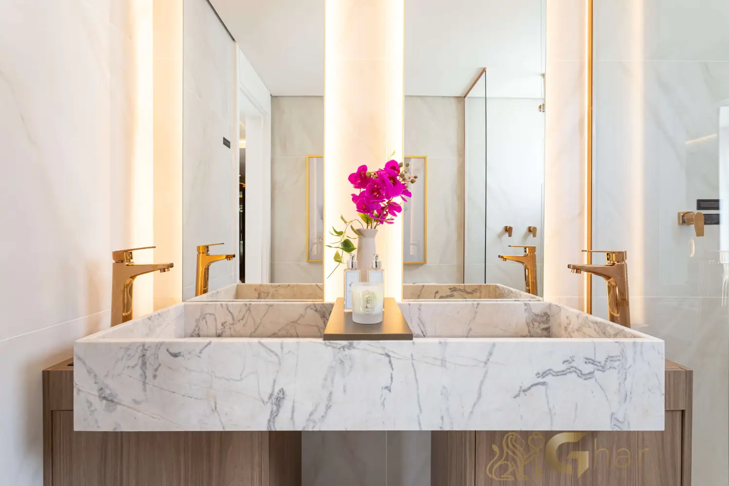 Ampla bancada equipada com duas cubas independentes, trazendo praticidade para o casal, agilidade na rotina e valorização do banheiro como um espaço de uso simultâneo.