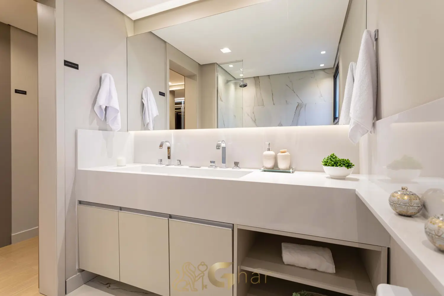 Ampla bancada equipada com duas cubas independentes, trazendo praticidade para o casal, agilidade na rotina e valorização do banheiro como um espaço de uso simultâneo.