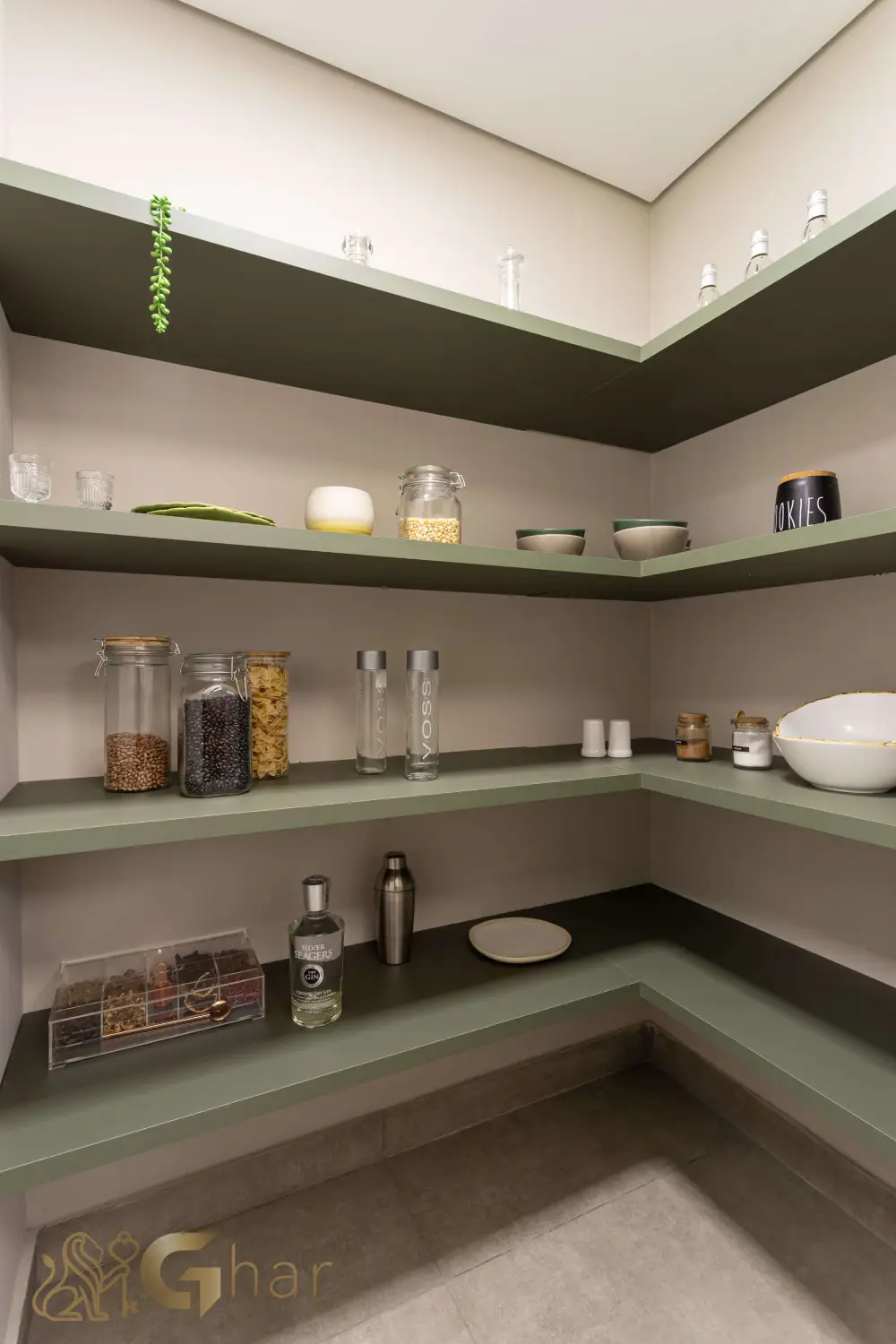 Espaço reservado próximo à cozinha ou área de serviço, perfeito para armazenar mantimentos, utensílios e produtos de limpeza, mantendo tudo organizado e acessível.