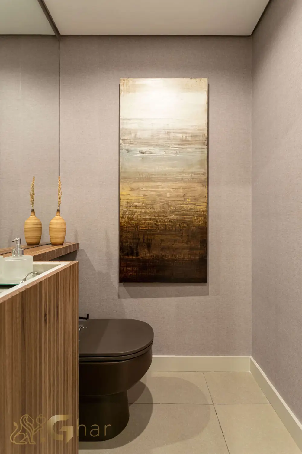 Banheiro de apoio elegante e funcional para atender visitantes, preservando a privacidade da área íntima da residência.