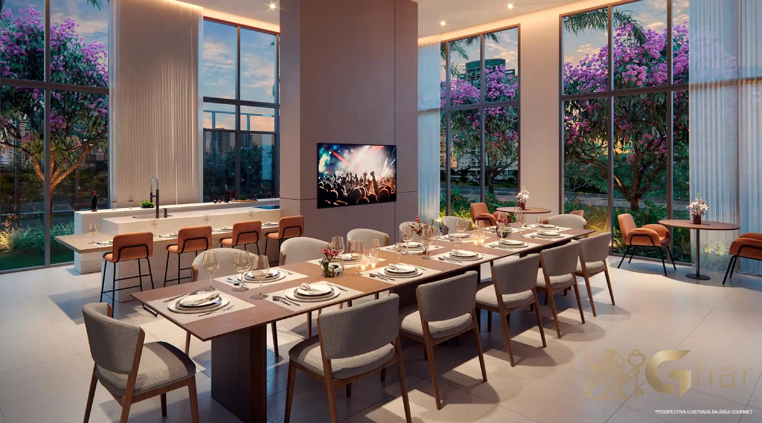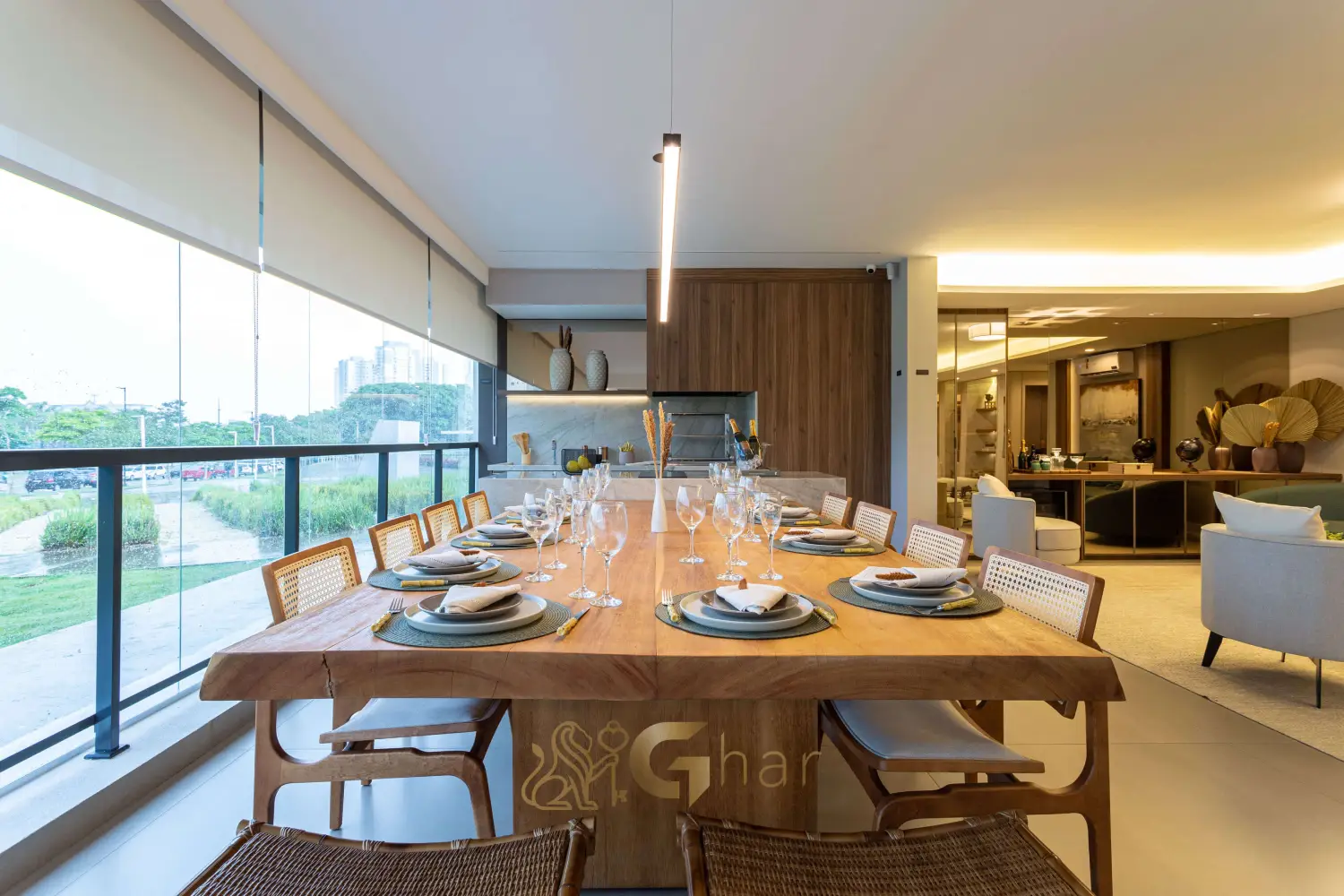 Sala de estar, jantar e terraço integrados em um espaço amplo e versátil, ideal para receber amigos, reunir a família ou criar diferentes ambientes. O design favorece a convivência e a iluminação natural.