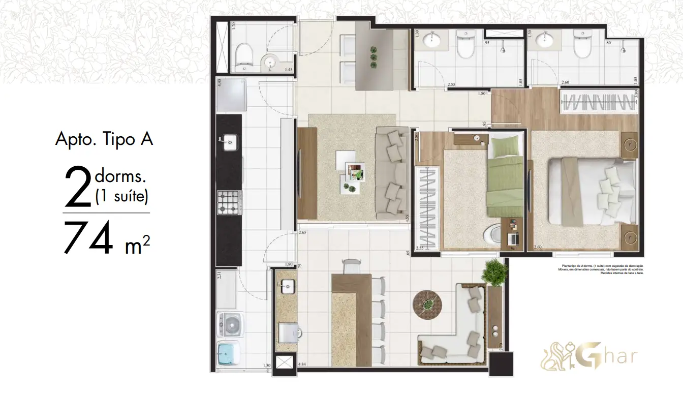 Apartamentos de 74 m² com 2 dormitórios (1 suíte)