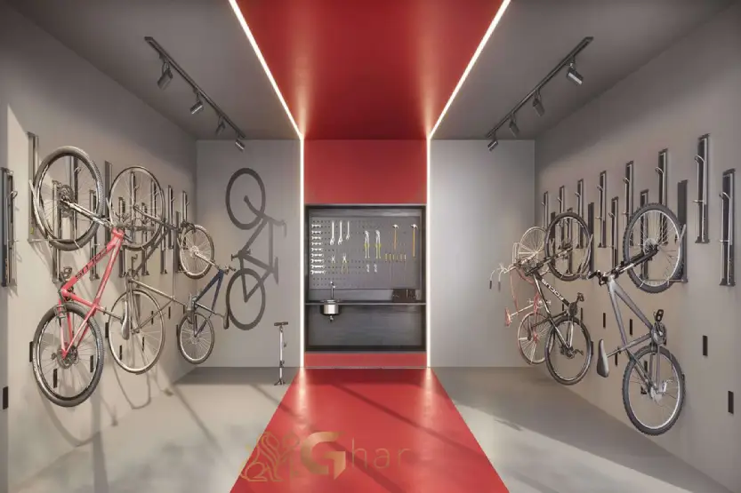 Estacionamento interno exclusivo para bicicletas, equipado com suportes e, em alguns casos, estação de manutenção, incentivando a mobilidade sustentável e saudável.