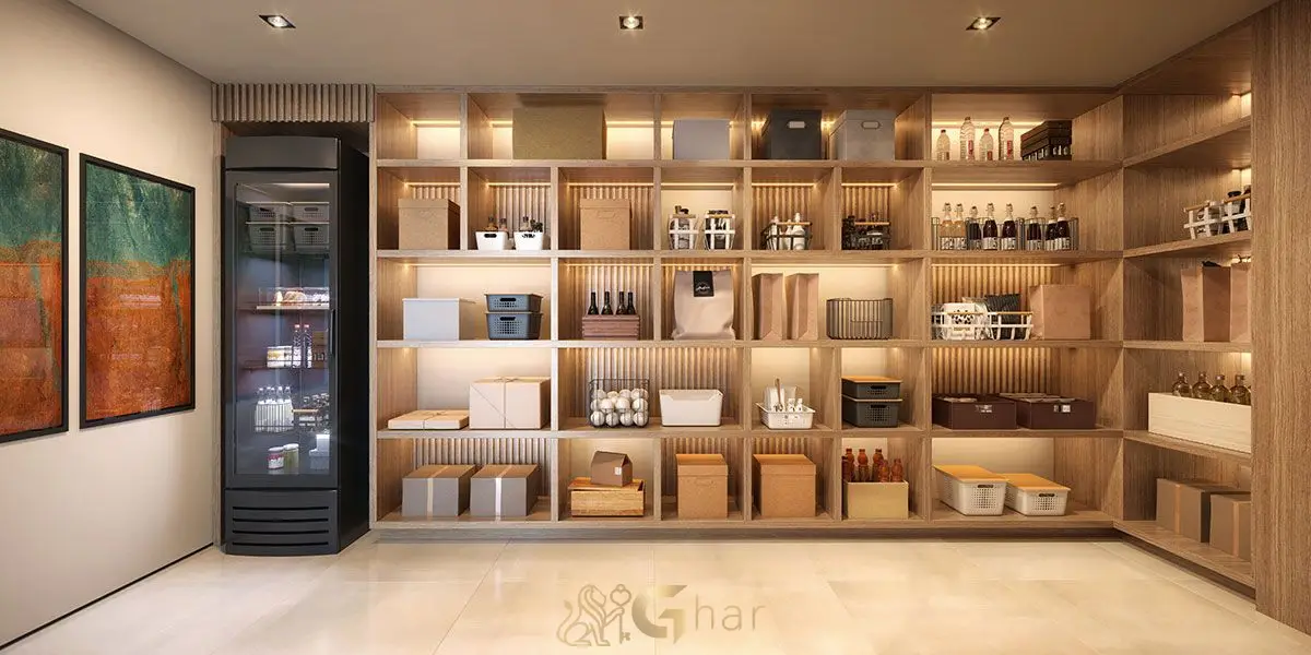Espaço reservado próximo à cozinha ou área de serviço, perfeito para armazenar mantimentos, utensílios e produtos de limpeza, mantendo tudo organizado e acessível.