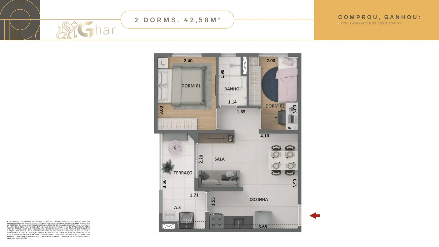 Todas as imagens têm caráter meramente ilustrativo e não constituem oferta de produto ou serviço. Em fotos de decorados, perspectivas artísticas e plantas com sugestão de decoração, os materiais efetivamente entregues seguem o memorial descritivo. Mobiliário, equipamentos, objetos de decoração, pisos, rodapés, louças, metais, molduras, forros, sancas e pontos de iluminação não integram o contrato de aquisição, salvo indicação expressa em documento comercial. Serviços de áreas comuns eventualmente citados dependem de deliberação em assembleia de condôminos. Os diferenciais mencionados podem não se aplicar a todas as unidades, ainda que de igual tipologia.