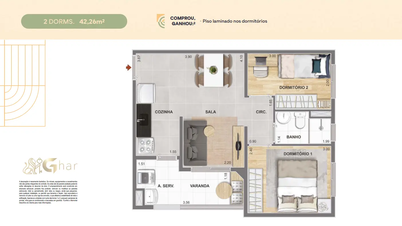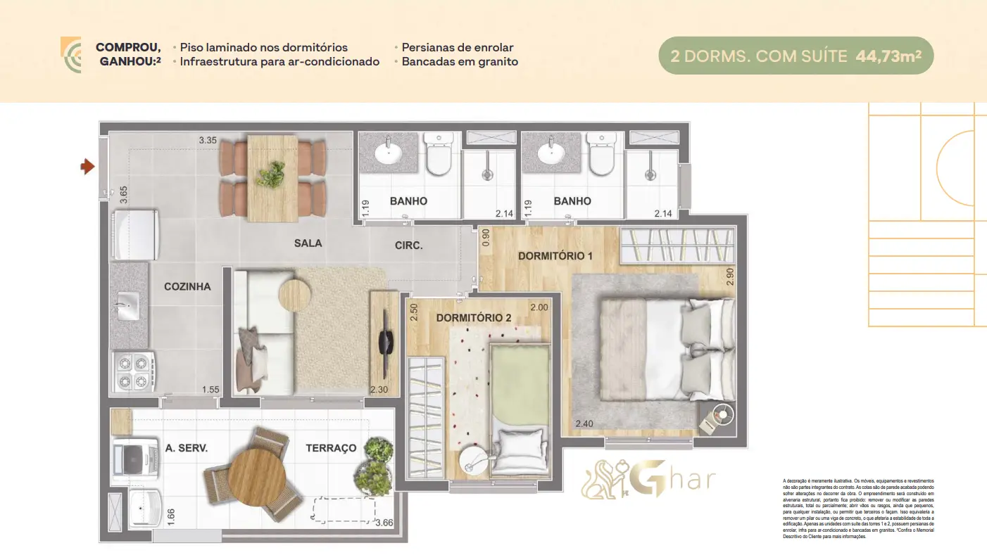 Todas as imagens têm caráter meramente ilustrativo e não constituem oferta de produto ou serviço. Em fotos de decorados, perspectivas artísticas e plantas com sugestão de decoração, os materiais efetivamente entregues seguem o memorial descritivo. Mobiliário, equipamentos, objetos de decoração, pisos, rodapés, louças, metais, molduras, forros, sancas e pontos de iluminação não integram o contrato de aquisição, salvo indicação expressa em documento comercial. Serviços de áreas comuns eventualmente citados dependem de deliberação em assembleia de condôminos. Os diferenciais mencionados podem não se aplicar a todas as unidades, ainda que de igual tipologia.