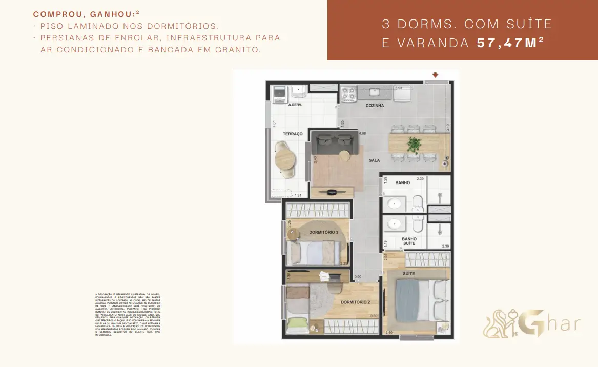 Todas as imagens têm caráter meramente ilustrativo e não constituem oferta de produto ou serviço. Em fotos de decorados, perspectivas artísticas e plantas com sugestão de decoração, os materiais efetivamente entregues seguem o memorial descritivo. Mobiliário, equipamentos, objetos de decoração, pisos, rodapés, louças, metais, molduras, forros, sancas e pontos de iluminação não integram o contrato de aquisição, salvo indicação expressa em documento comercial. Serviços de áreas comuns eventualmente citados dependem de deliberação em assembleia de condôminos. Os diferenciais mencionados podem não se aplicar a todas as unidades, ainda que de igual tipologia.