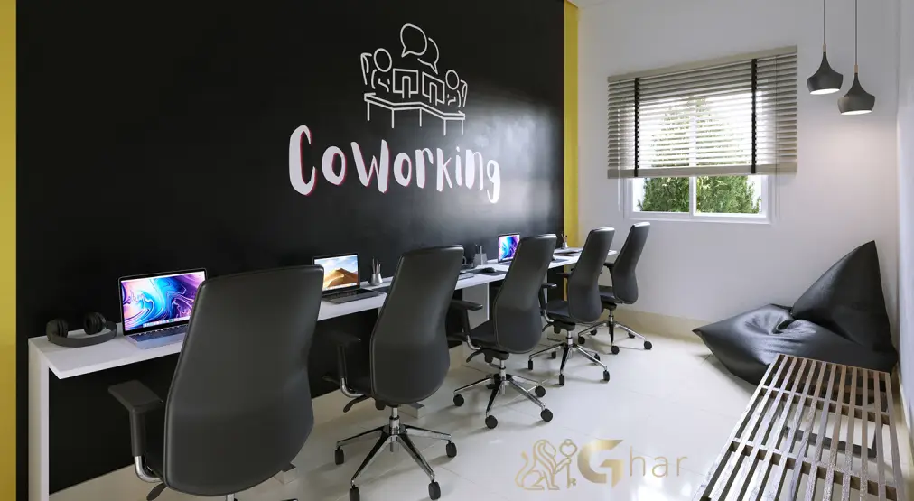 Ambiente equipado para trabalho remoto, com mesas, cadeiras ergonômicas, internet de alta velocidade e tomadas, ideal para reuniões e atividades profissionais.