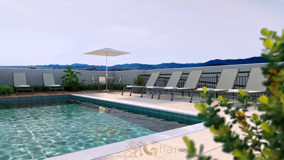 Espaços de lazer exclusivos no topo do edifício, como piscina, lounge, salão gourmet ou área de convivência, proporcionando vista privilegiada e ambiente sofisticado.