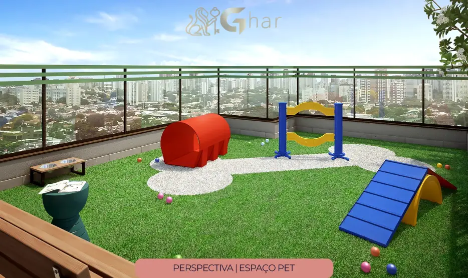 Área dedicada para cães e gatos, equipada com brinquedos, pistas de agility e espaços para socialização dos pets com segurança e comodidade.