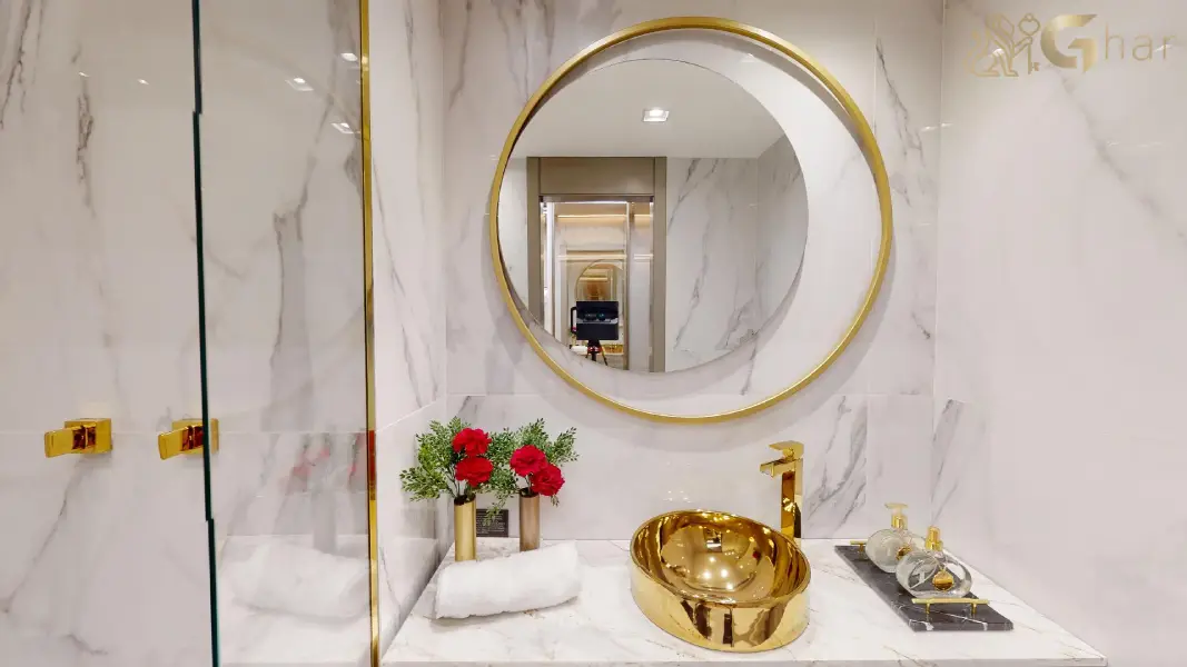 Banheiro de apoio elegante e funcional para atender visitantes, preservando a privacidade da área íntima da residência.