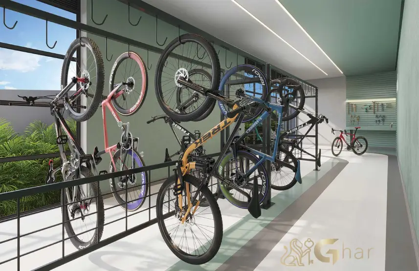 Estacionamento interno exclusivo para bicicletas, equipado com suportes e, em alguns casos, estação de manutenção, incentivando a mobilidade sustentável e saudável.