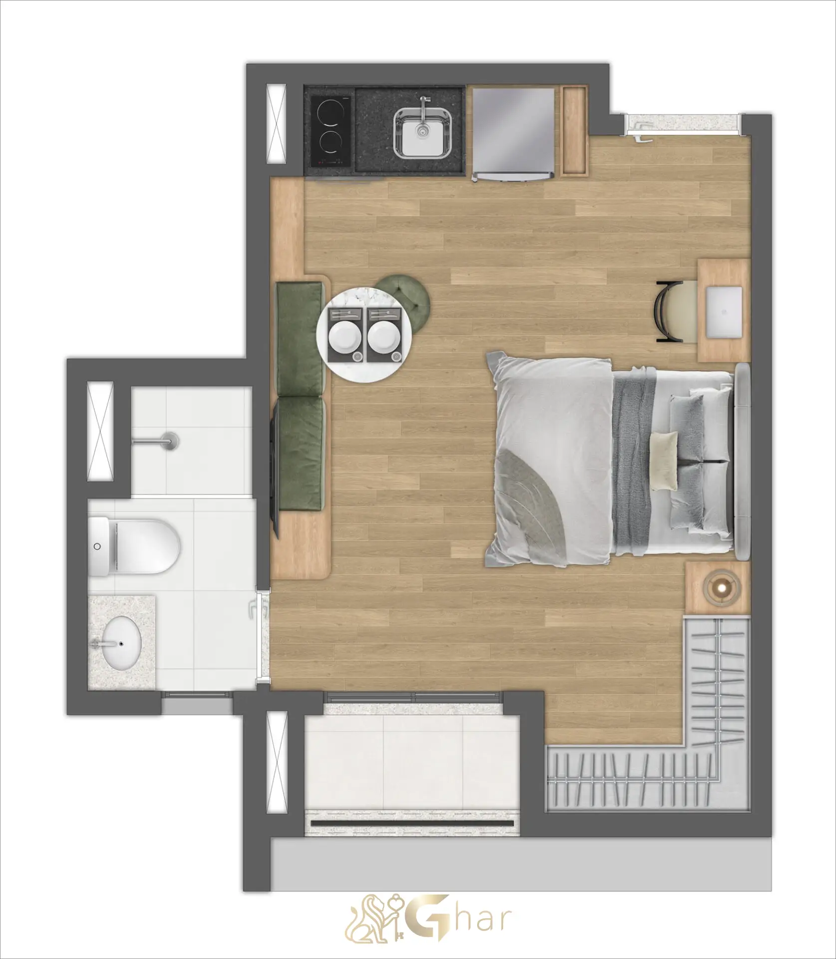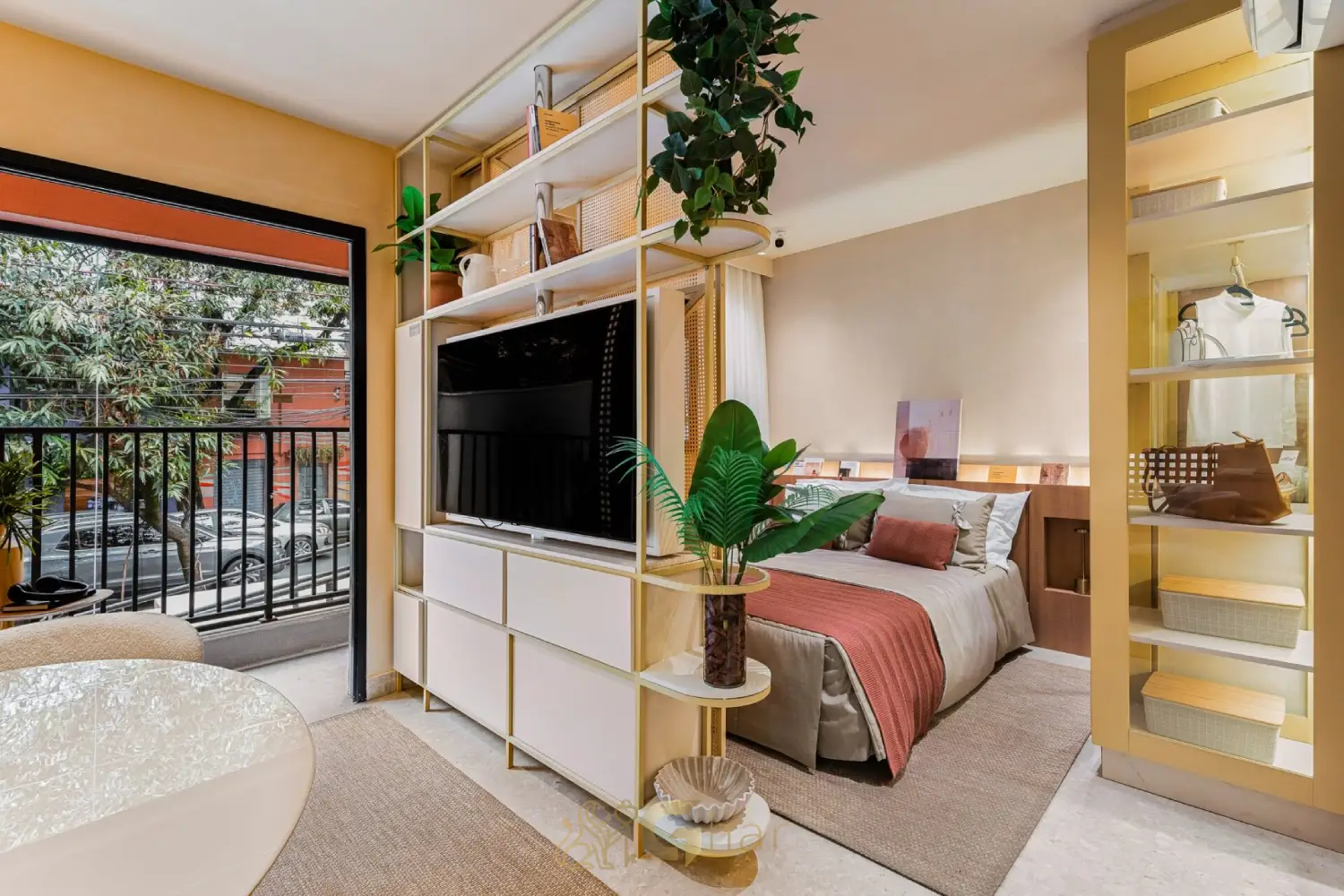 Nos decorados do Joá Pinheiros, é possível visualizar como cada metro quadrado foi pensado para oferecer praticidade sem abrir mão do conforto. As plantas de 24 m² a 29 m² mostram a integração entre sala, dormitório e cozinha, além de um terraço funcional que amplia a experiência de morar em Pinheiros. Cada detalhe reflete a proposta do projeto: modernidade, conveniência e qualidade de vida em uma das regiões mais valorizadas de São Paulo.