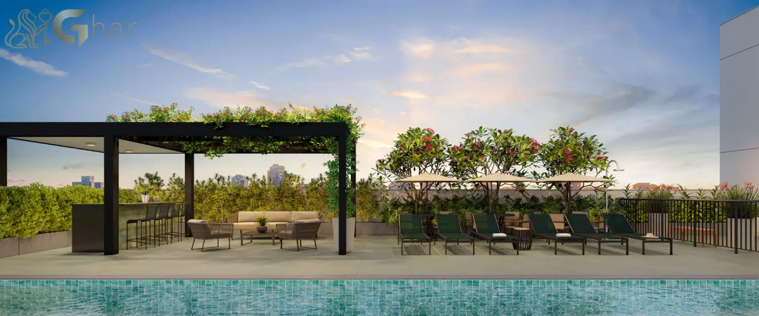 Espaços de lazer exclusivos no topo do edifício, como piscina, lounge, salão gourmet ou área de convivência, proporcionando vista privilegiada e ambiente sofisticado.