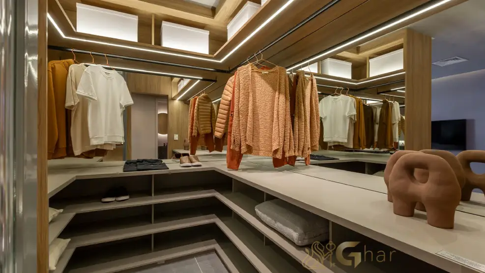 Suíte principal com espaço dedicado para closet, ideal para organizar roupas, calçados e acessórios de forma prática e elegante.