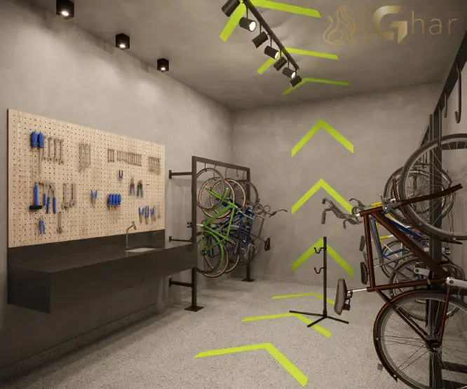 Estacionamento interno exclusivo para bicicletas, equipado com suportes e, em alguns casos, estação de manutenção, incentivando a mobilidade sustentável e saudável.