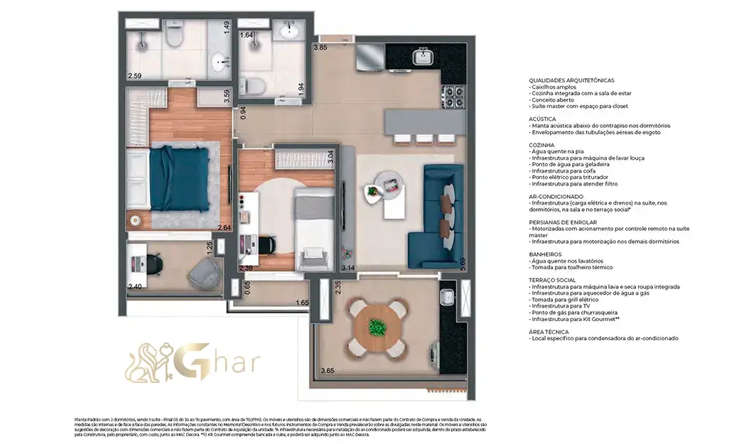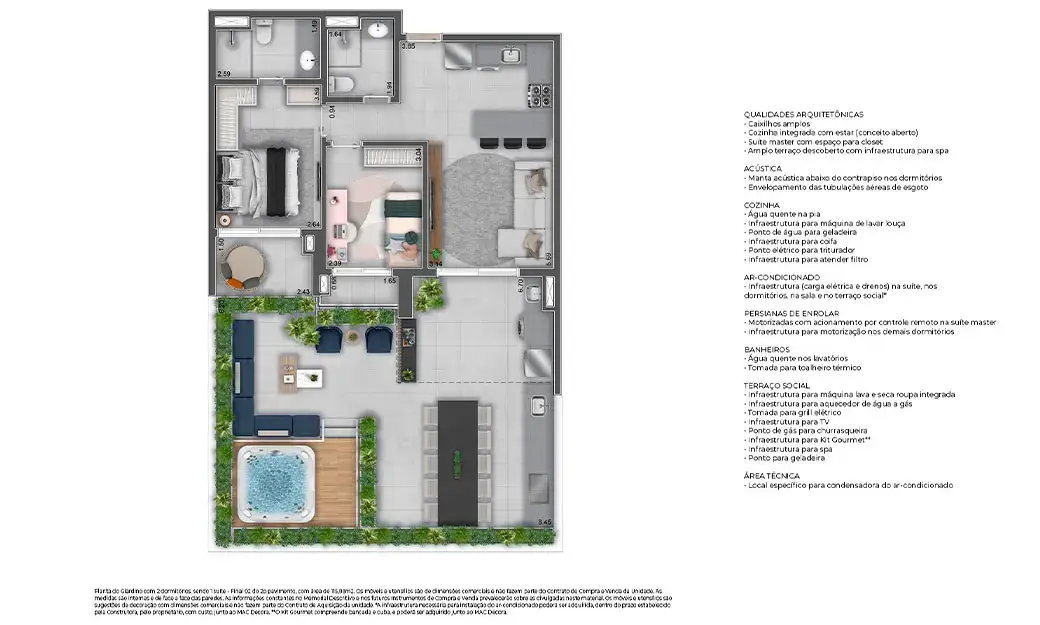 Todas as imagens têm caráter meramente ilustrativo e não constituem oferta de produto ou serviço. Em fotos de decorados, perspectivas artísticas e plantas com sugestão de decoração, os materiais efetivamente entregues seguem o memorial descritivo. Mobiliário, equipamentos, objetos de decoração, pisos, rodapés, louças, metais, molduras, forros, sancas e pontos de iluminação não integram o contrato de aquisição, salvo indicação expressa em documento comercial. Serviços de áreas comuns eventualmente citados dependem de deliberação em assembleia de condôminos. Os diferenciais mencionados podem não se aplicar a todas as unidades, ainda que de igual tipologia.
