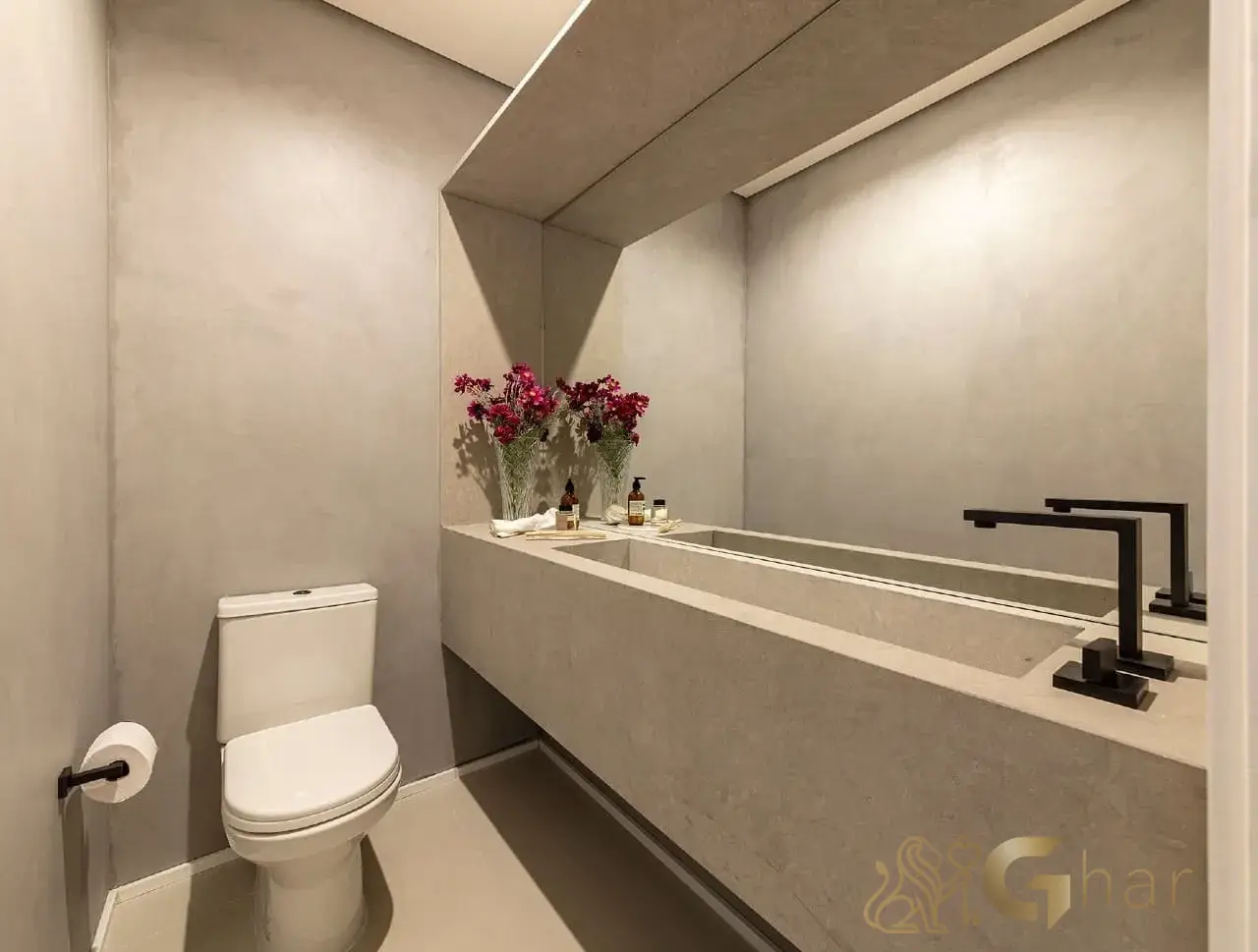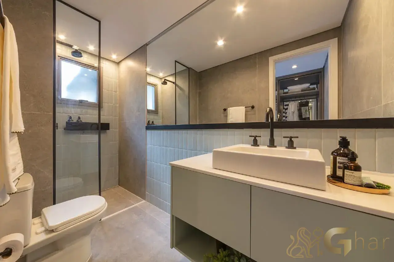 Banheiro de apoio elegante e funcional para atender visitantes, preservando a privacidade da área íntima da residência.