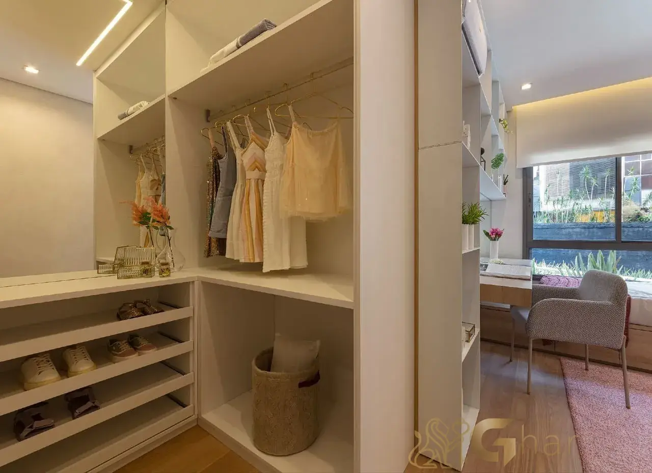 Suíte principal com espaço dedicado para closet, ideal para organizar roupas, calçados e acessórios de forma prática e elegante.