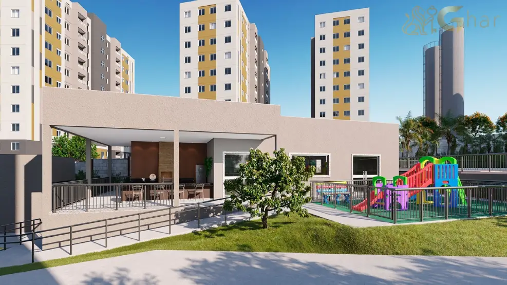 O condomínio oferece apartamentos de 2 dormitórios, alguns com opção de varanda, além de lazer completo, incluindo piscinas, playground, bicicletário, pet place, salão de festas e espaço gourmet com churrasqueira.