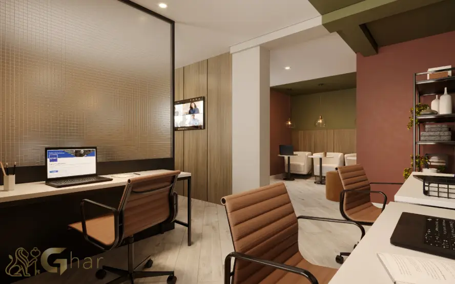 Ambiente equipado para trabalho remoto, com mesas, cadeiras ergonômicas, internet de alta velocidade e tomadas, ideal para reuniões e atividades profissionais.