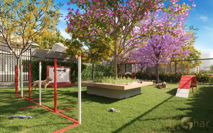 Área dedicada para cães e gatos, equipada com brinquedos, pistas de agility e espaços para socialização dos pets com segurança e comodidade.